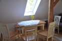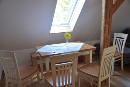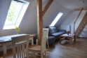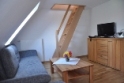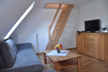 Im Wohnzimmer finden Sie eine Couch, Essecke und angegliederte Küchenzeile.