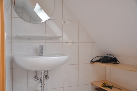 Das Bad ist mit Dusche (Echtglaskabine) , WC und Waschbecken ausgestattet. |