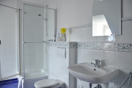 Bad mit Dusche (Echtglaskabine), WC und Waschbecken,