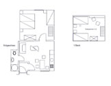 Das Elternschlafzimmer hat 3 Betten und einen großen Kleiderschrank. Im Kinderzimmer, das über eine steile Treppe vom Elternschlafzimmer aus erreichbar ist
